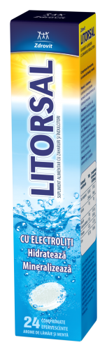 Cu arome răcoritoare de mentă și lămâie, LITORSAL, sub formă de comprimate efervescente, hidratează organismul și potolește eficient setea, ajută la echilibrarea balanței electrolitice și asigură un aport de glucoză, cu rol în funcționarea normală a inimii și a creierului. Ingredientele acestuia – vitamina C, potasiu, sodiu și glucoză – echilibrează balanța electrolitică astfel încât noi ne vom putea păstra energia în ciuda disconfortului cauzat de temperaturile ridicate sau de efortul fizic depus. În plus, Litorsal este recomandat și în cazul deshidratării cauzate de vărsături, episoade diareice sau în urma consumului excesiv de alcool.